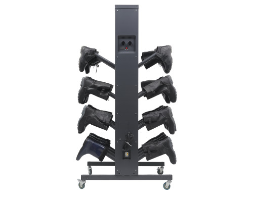 Принцип работы заключается в нагнетании теплого воздуха внутрь обуви через патрубки. Влажная обувь навешивается на расположенные на корпусе стойки кронштейны, через которые подается теплый воздух. Таким образом, конвекция воздуха происходит непосредственно во внутренней части ботинка, что существенно ускоряет процесс сушки. Каждый патрубок для обуви снабжен инерционным клапаном, перекрывает подачу воздуха, если ботинок не одет.
